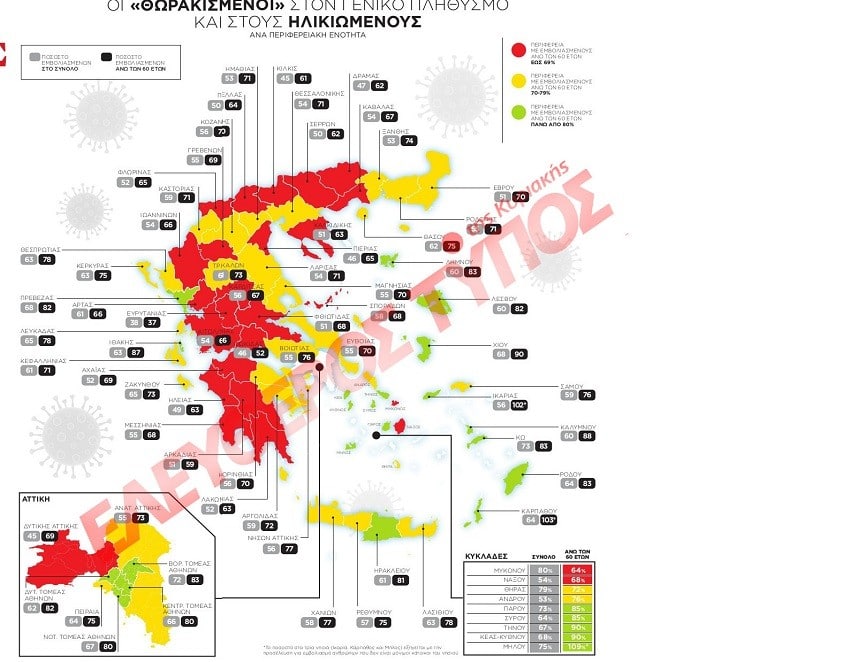 Αν και η εικόνα είναι καλύτερη στους πολίτες ηλικίας άνω των 60 ετών, 24 Περιφερειακές Ενότητες βρίσκονται κάτω από το φράγμα του 70%, με την Ευρυτανία να είναι καθηλωμένη στο 37%.