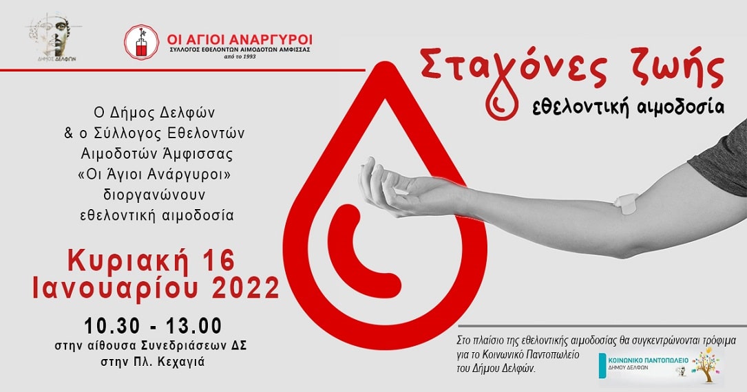 Ο Δήμος Δελφών και ο Σύλλογος Εθελοντών Αιμοδοτών Άμφισσας «Οι Άγιοι Ανάργυροι» διοργανώνουν την πρώτη εθελοντική αιμοδοσία για το 2022.