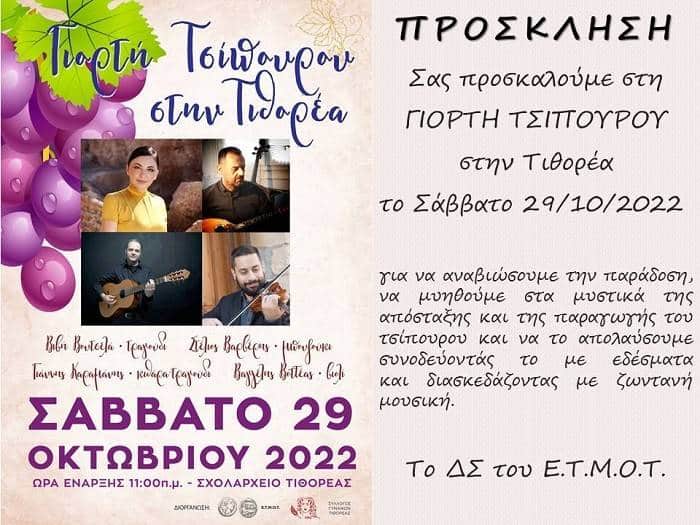 "Γιορτή Τσίπουρου 2022" Μετά από απουσία δύο χρόνων ξανανταμώνουμε!!! Θα πιούμε... Θα φάμε... Θα χορέψουμε... Θα γίνουμε όλοι μια παρέα!!!