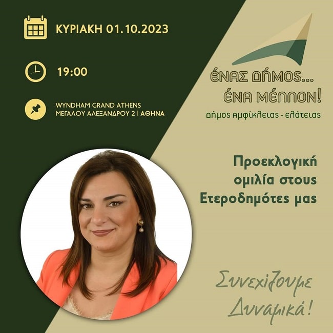 Θα είναι ιδιαίτερη τιμή, για εμένα και τους υποψήφιους του συνδυασμού μας “Ένας Δήμος… Ένα Μέλλον!, η παρουσία σας στην προεκλογική μου ομιλία για τους ετεροδημότες στην Αθήνα, την Κυριακή 1 Οκτωβρίου 2023 και ώρα 19:00 στο ξενοδοχείο Wyndham Grand Athens.