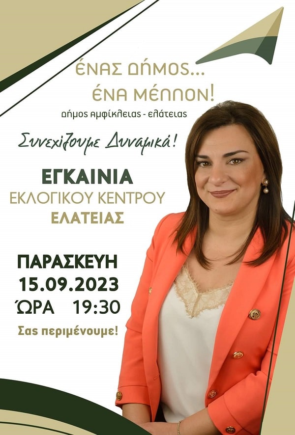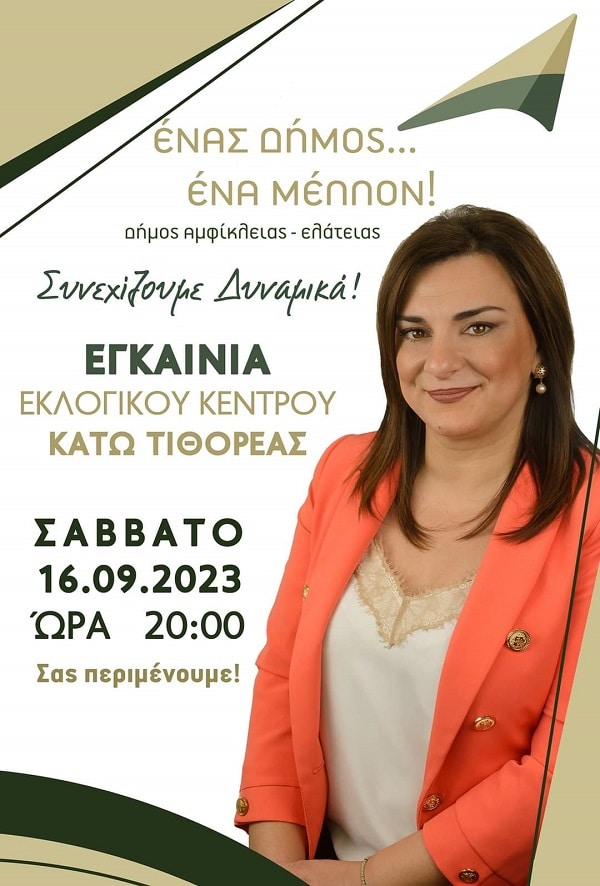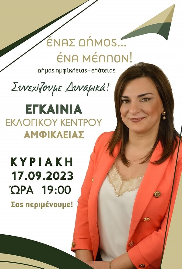 Σας προσκαλούμε στα εγκαίνια των εκλογικών μας κέντρων, που θα πραγματοποιηθούν Παρασκευή 15, Σάββατο 16 & Κυριακή 17 Σεπτεμβρίου 2023, σε Ελάτεια, Κάτω Τιθορέα και Αμφίκλεια αντίστοιχα.
