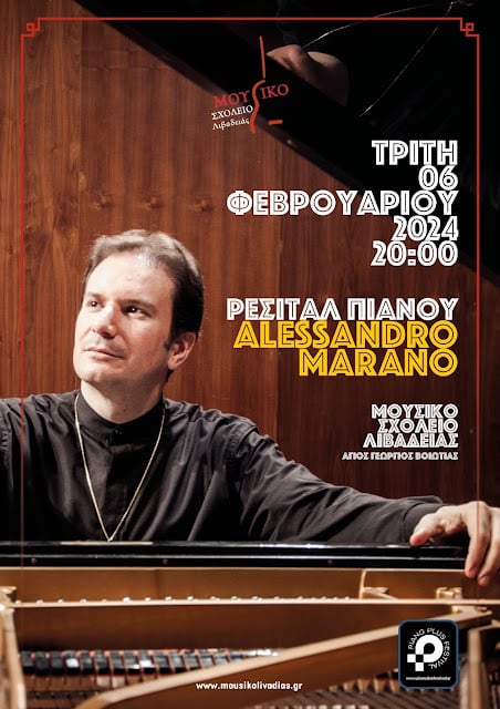 Ο πιανίστας Alessandro Marano, μαθητής του Aldo Ciccolini, νικητής σε πάνω από 40 διεθνείς και εθνικούς διαγωνισμούς πιάνου θα μας χαρίσει μία αξέχαστη μουσική εμπειρία σε ένα ρεπερτόριο που καλύπτει ένα τεράστιο φάσμα χαρακτήρων, συναισθημάτων και ηχοχρωμάτων στην αίθουσα συναυλιών του Μουσικού Σχολείου Λιβαδειάς την Τρίτη 6 Φεβρουαρίου 2024 στις 8 το βράδυ,ενώ την προηγούμενη ημέρα 5 Φεβρουαρίου θα παρουσιαστεί στο Μέγαρο Μουσικής στην Αθήνα.