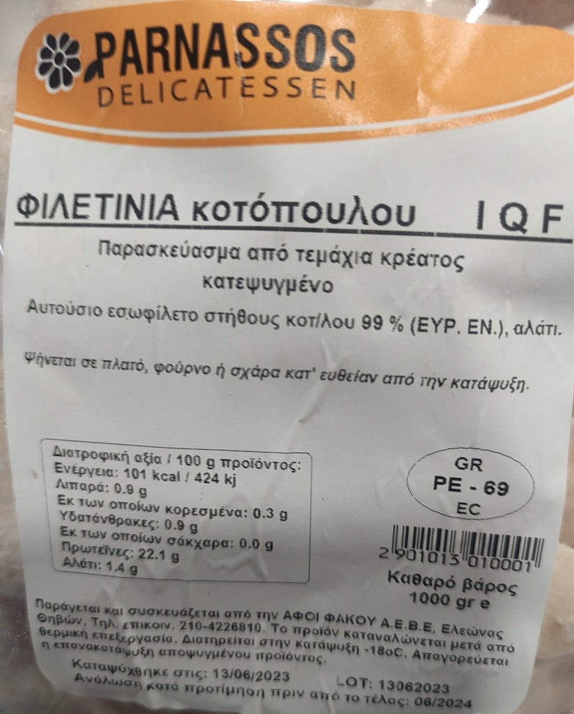 Επιπλέον, ο ΕΦΕΤ προέβη σε δειγματοληψία του προϊόντος, «ΦΙΛΕΤΙΝΙΑ ΚΟΤΟΠΟΥΛΟΥ IQF PARNASSOS DELICATESSEN κατεψυγμένο», καθ. βάρους 1000 γρ., αριθ. παρτίδας: 13062023, ημ.ανάλωσης κατά προτίμηση πριν από το τέλος: 06/2024, που παρασκευάζεται από την εταιρεία «ΑΦΟΙ ΦΑΚΟΥ ΑΕΒΕ», στον Ελαιώνα Θηβών.