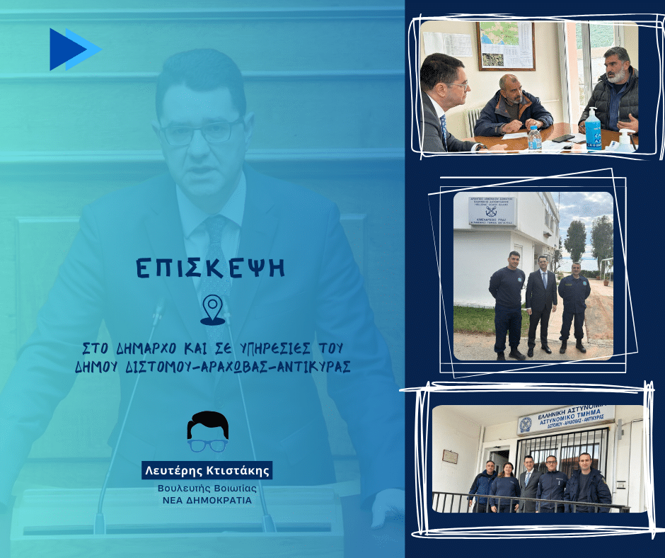 Τη Δευτέρα 15 Ιανουαρίου πραγματοποιήθηκε επίσκεψη στο Δημαρχείο και σε υπηρεσίες στον ευρύτερο Δήμο Διστόμου – Αράχωβας – Αντίκυρας, με σκοπό την καταγραφή των προβλημάτων που αντιμετωπίζουν και την πρόθεση εκ μέρους του Βουλευτή Βοιωτίας κ. Λευτέρη Κτιστάκη, να μεταφερθούν προς επίλυση στους αρμόδιους κυβερνητικούς φορείς.
