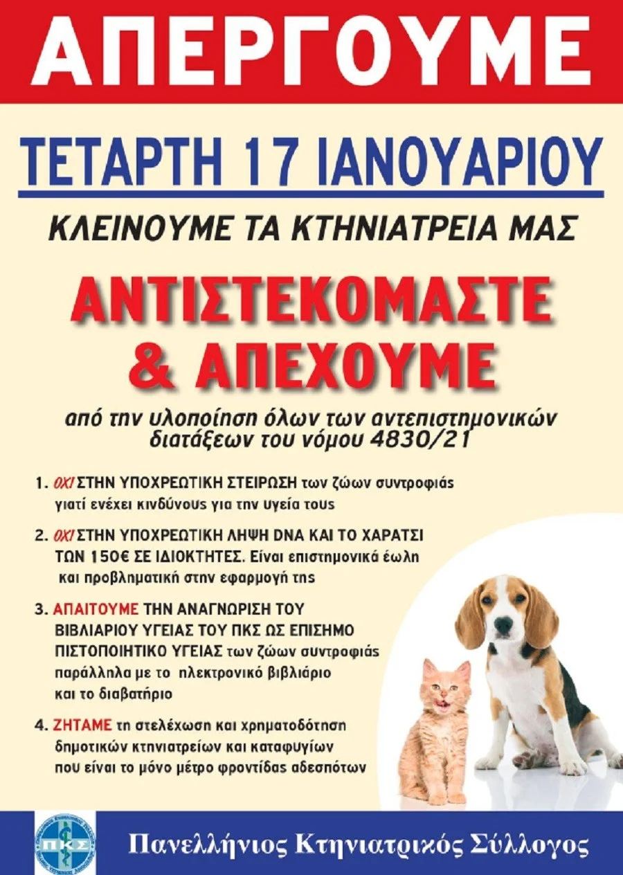 Σε απεργία οι κτηνίατροι την Τετάρτη 17/1, καταγγέλλοντας ως αντιεπιστημονικές τις διατάξεις του νόμου για τα ζώα συντροφιάς. Όπως αναφέρει ο Πανελλήνιος Κτηνιατρικός Σύλλογος λένε όχι:
