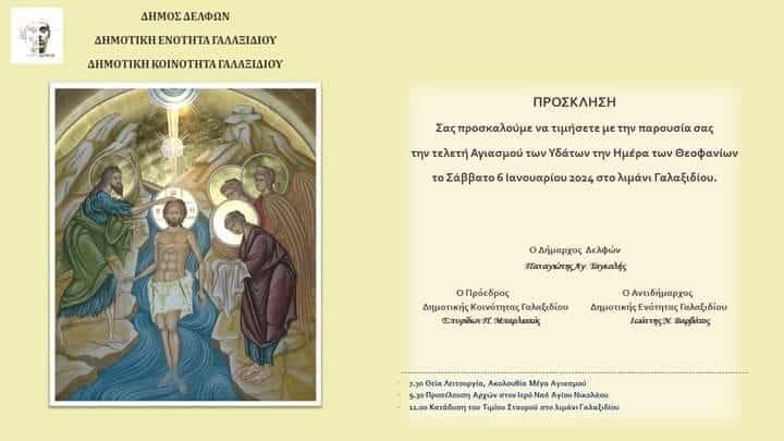Επίσης, αντιστοίχως θα τελεστεί η Θεία Λειτουργία και η Ακολουθία του Μεγάλου Αγιασμού των Θεοφανίων στον Ιερό Ναό Αγίου Νικολάου Γαλαξιδίου, ενώ στις 11:00πμ θα ακολουθήσει η κατάδυση του Τιμίου Σταυρού και ο καθαγιασμός των υδάτων στο λιμάνι Γαλαξιδίου.