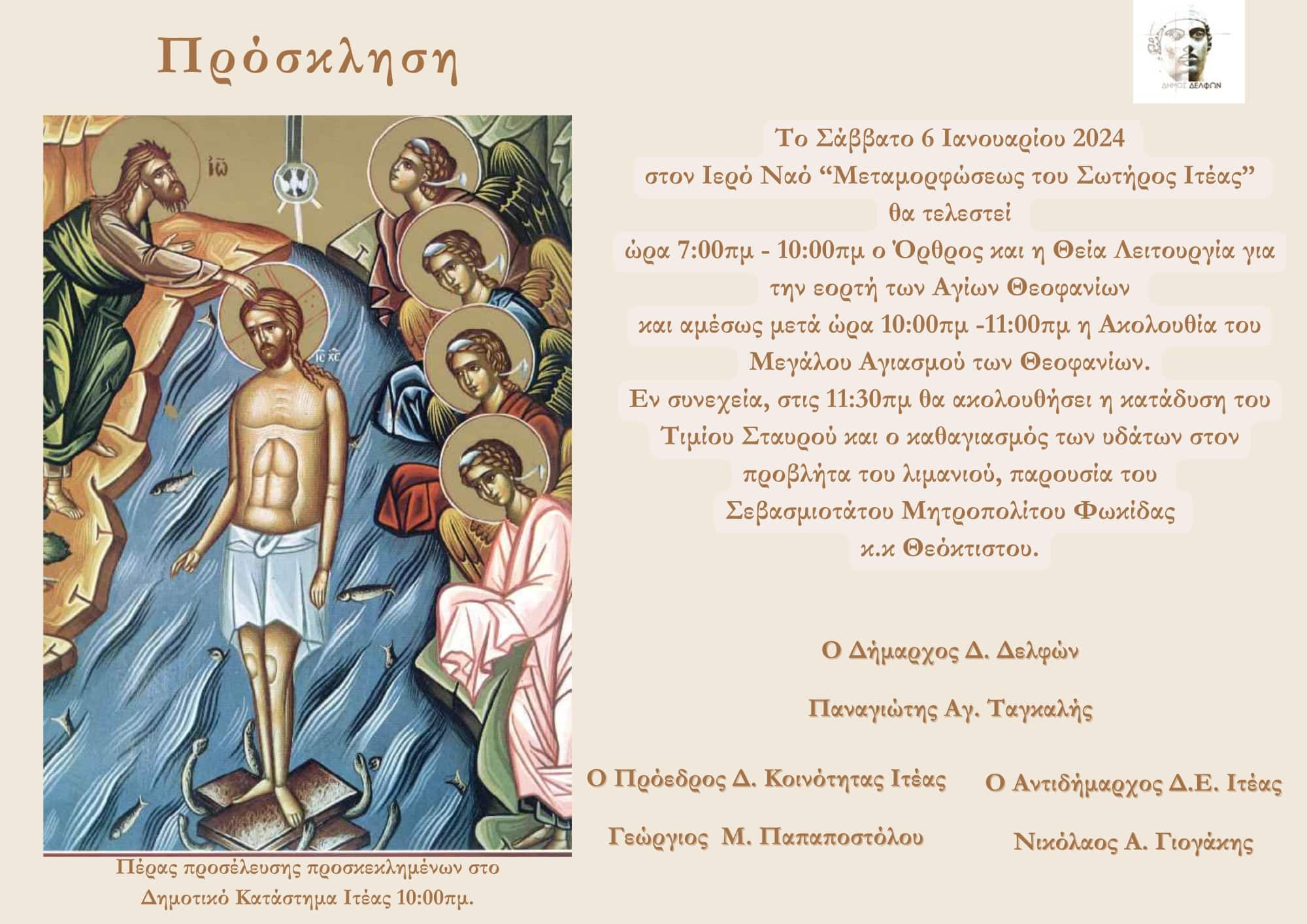 Το Σάββατο 6 Ιανουαρίου 2024 στον Ιερό Ναό Μεταμορφώσεως του Σωτήρος Ιτέας, από τις 7:00πμ έως τις 10:00πμ, θα τελεστεί ο Όρθρος και η Θεία Λειτουργία για την εορτή των Αγίων Θεοφανίων και αμέσως μετά η Ακολουθία του Μεγάλου Αγιασμού των Θεοφανίων.