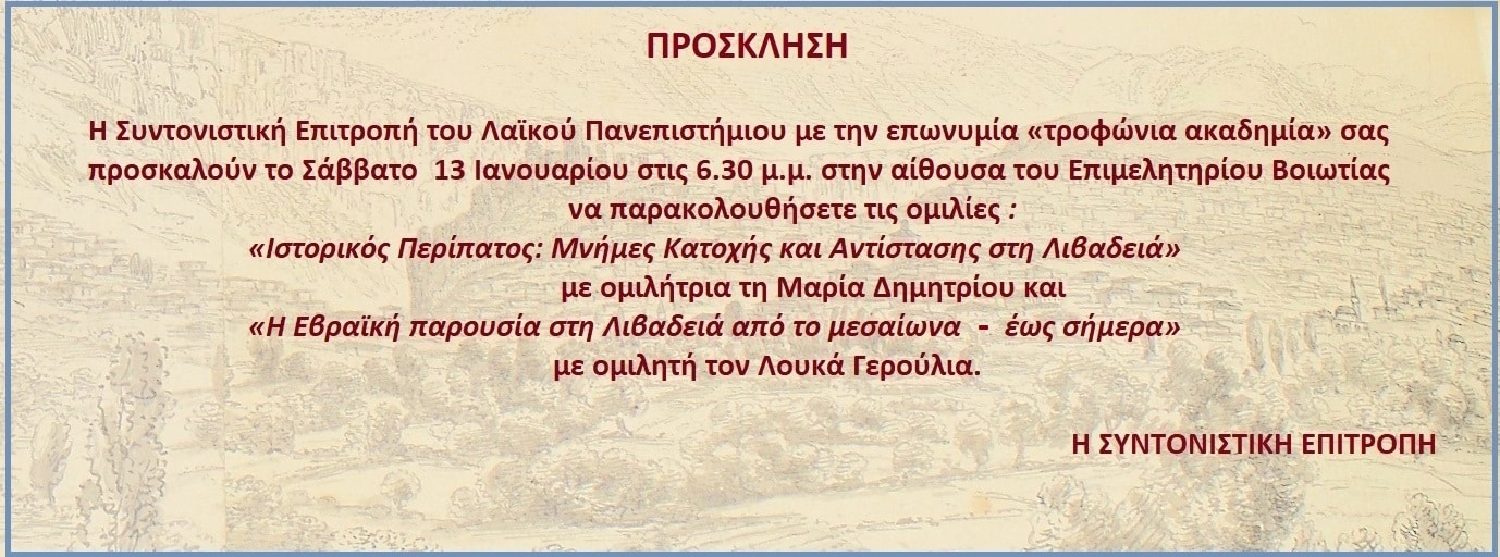 Η Συντονιστική Επιτροπή της τροφώνιας ακαδημίας στα πλαίσια του 3ου κύκλου της θεματικής ενότητας: «Λιβαδειά: Η πόλη, οι πολίτες, ο πολιτισμός. Από το παρελθόν στο παρόν. Από το παρόν στο μέλλον»