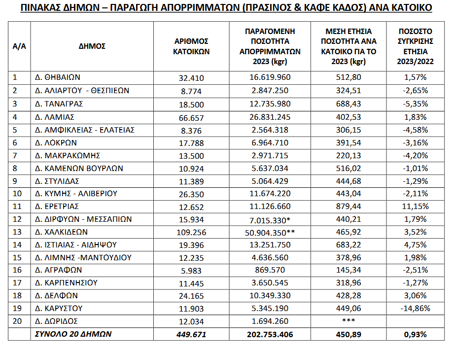 – ***Η ποσότητα ανά κάτοικο του Δήμου Δωρίδας δεν μπορεί να υπολογιστεί καθώς ο Δήμος