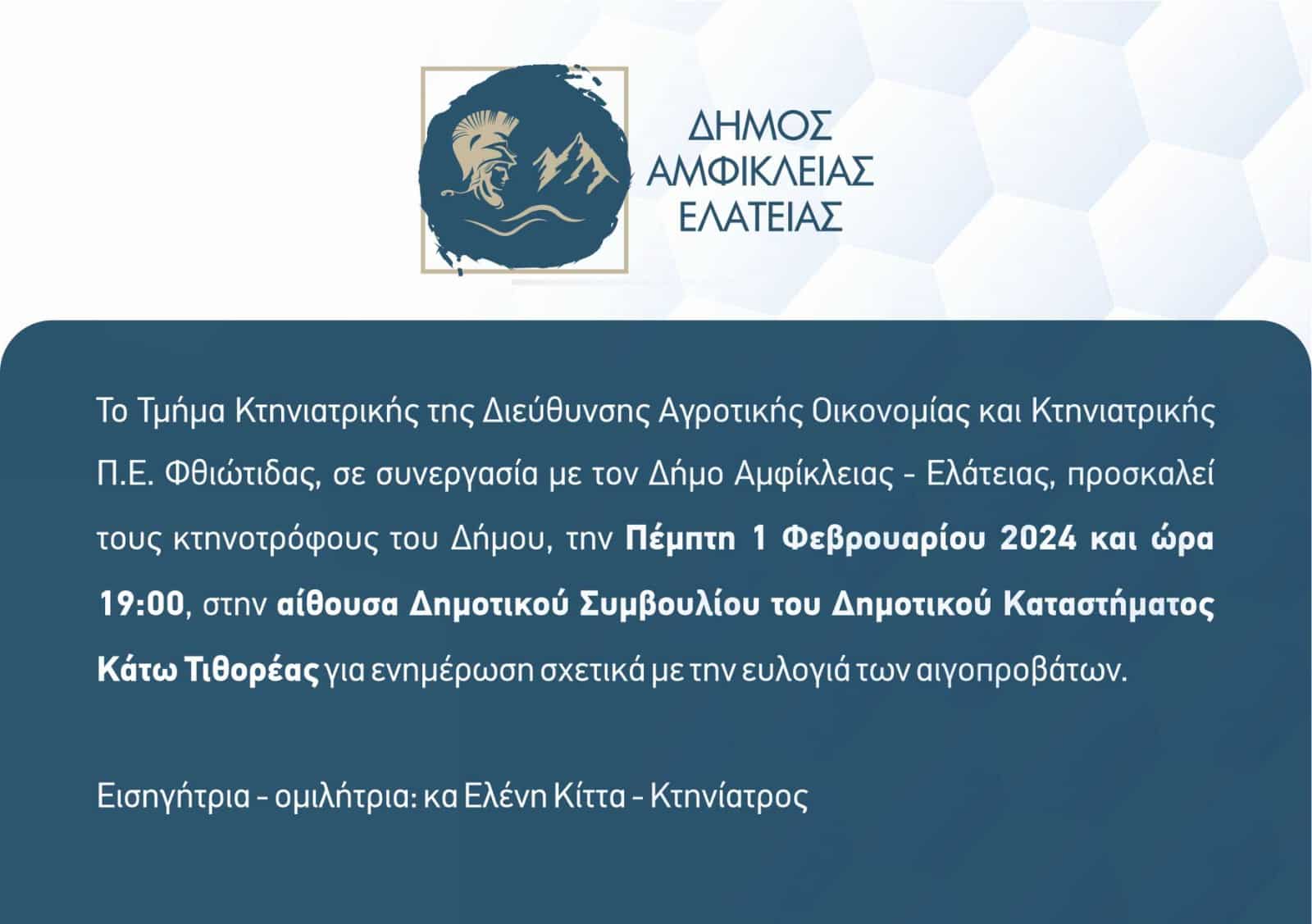 Το Τμήμα Κτηνιατρικής της Διεύθυνσης Αγροτικής Οικονομίας και Κτηνιατρικής Π.Ε. Φθιώτιδας, σε συνεργασία με τον Δήμο Αμφίκλειας – Ελάτειας, προσκαλεί τους κτηνοτρόφους του Δήμου, την Πέμπτη 1 Φεβρουαρίου 2024 και ώρα 19:00, στην αίθουσα Δημοτικού Συμβουλίου του Δημοτικού Καταστήματος Κάτω Τιθορέας για ενημέρωση σχετικά με την ευλογιά των αιγοπροβάτων. Εισηγήτρια – ομιλήτρια: κα Ελένη Κίττα – Κτηνίατρος.