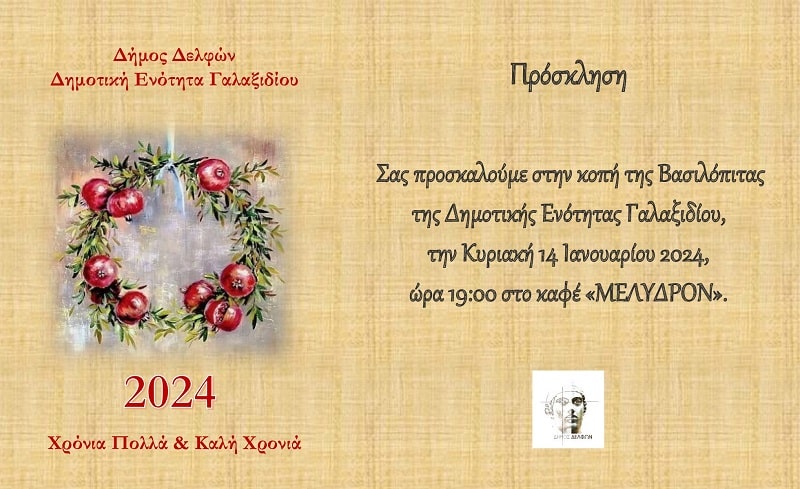 Ο Δήμαρχος Δελφών κ. Παναγιώτης Ταγκαλής και ο Αντιδήμαρχος Δ.Ε. Γαλαξιδίου κ. Ιωάννης Βαρβάτος προσκαλούν στην κοπή της Πρωτοχρονιάτικης Βασιλόπιτας της Δ.Ε. Γαλαξιδίου, η οποία θα πραγματοποιηθεί την Κυριακή 14 Ιανουαρίου 2024, στις 19:00, στο καφέ «ΜΕΛΥΔΡΟΝ».