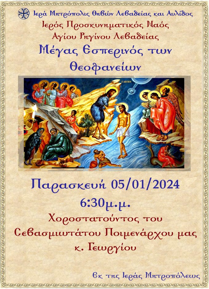 Θα ξεκινήσει ο εορτασμός απο την Μητρόπολη Λιβαδειάς το προηγούμενο απόγευμα στον Ναό του Αγίου Ρηγίνου την Παρασκευή 5 Ιανουαρίου με τον ΜΕΓΑ ΕΣΠΕΡΙΝΟ ΤΩΝ ΘΕΟΦΑΝΕΙΩΝ