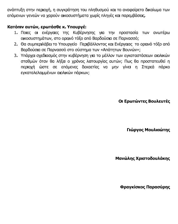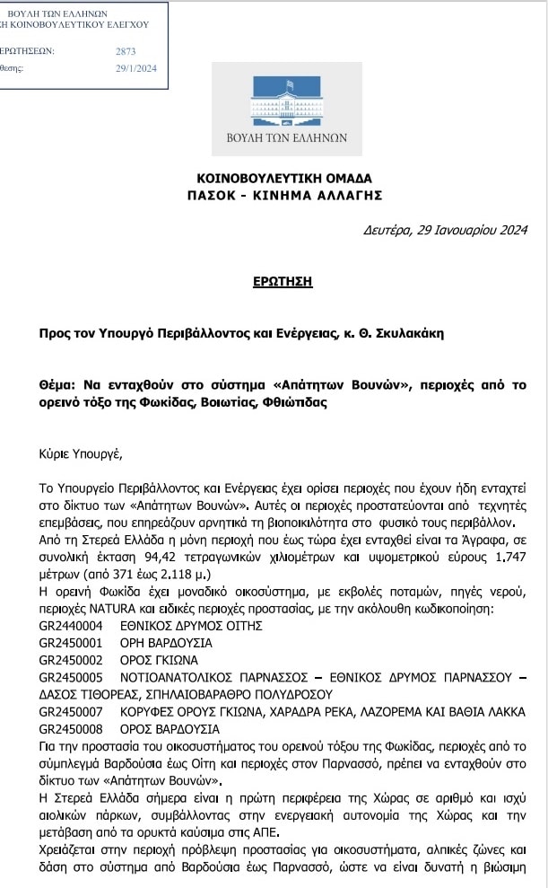 Θα ήθελα, θεσμικά ως αρμόδια Αντιπεριφερειάρχης, να σας παρακαλέσω να εξετάσετε την πρόταση μας – που πήρε τη μορφή και Κοινοβουλευτικής Ερώτησης – για το πως περιοχές και οικοσυστήματα από Βαρδούσια έως και Παρνασσό, θα μπορούσαν να ενταχθούν σε προστασία, σε πρώτη τουλάχιστον φάση, στο δίκτυο των «Απάτητων Βουνών».