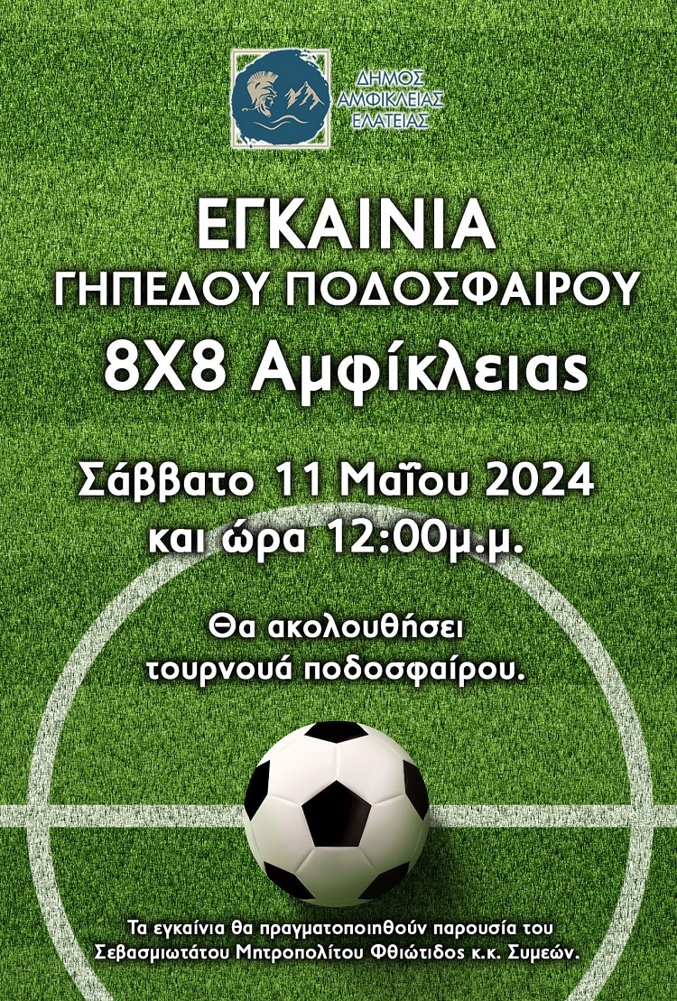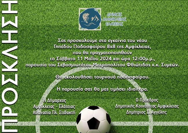 Με μεγάλη χαρά σας προσκαλούμε στα εγκαίνια του νέου Γηπέδου Ποδοσφαίρου 8×8 της Αμφίκλειας, που θα πραγματοποιηθούν το Σάββατο 11 Μαΐου 2024 και ώρα 12:00μ.μ., παρουσία του Σεβασμιωτάτου Μητροπολίτου Φθιώτιδος κ.κ. Συμεών.