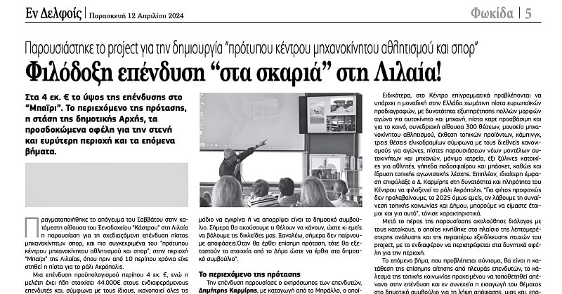 Όπως σας είχε ενημερώσει η Εν Δελφοίς με αναλυτικό ρεπορτάζ της στις 12 Απριλίου, στις αρχές εκείνου του μήνα είχε πραγματοποιηθεί στη Λιλαία παρουσίαση από εκπρόσωπο της ενδιαφερόμενης επενδυτικής ομάδας του “πρότυπου κέντρου μηχανοκίνητου αθλητισμού και σπορ”, στην περιοχή “Μπαϊρι” της Λιλαίας (φώτο), όπου πριν από 10 περίπου χρόνια είχε στηθεί η πίστα για το ράλι Ακρόπολις.