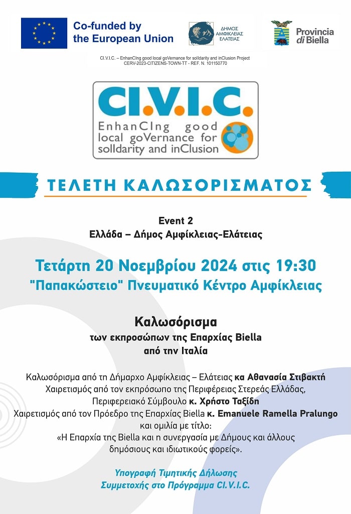 Την πρώτη ημέρα, 20 Νοεμβρίου 2024 και ώρα 19:30, θα πραγματοποιηθεί Τελετή Καλωσορίσματός τους στο Παπακώστειο Πνευματικό Κέντρο Αμφίκλειας, όπου θα υπογραφεί και επίσημο έγγραφο συμμετοχής στο πρόγραμμα και σας προσκαλούμε να τιμήσετε, τόσο εμάς όσο και την Ιταλική αντιπροσωπεία, με την παρουσία σας.