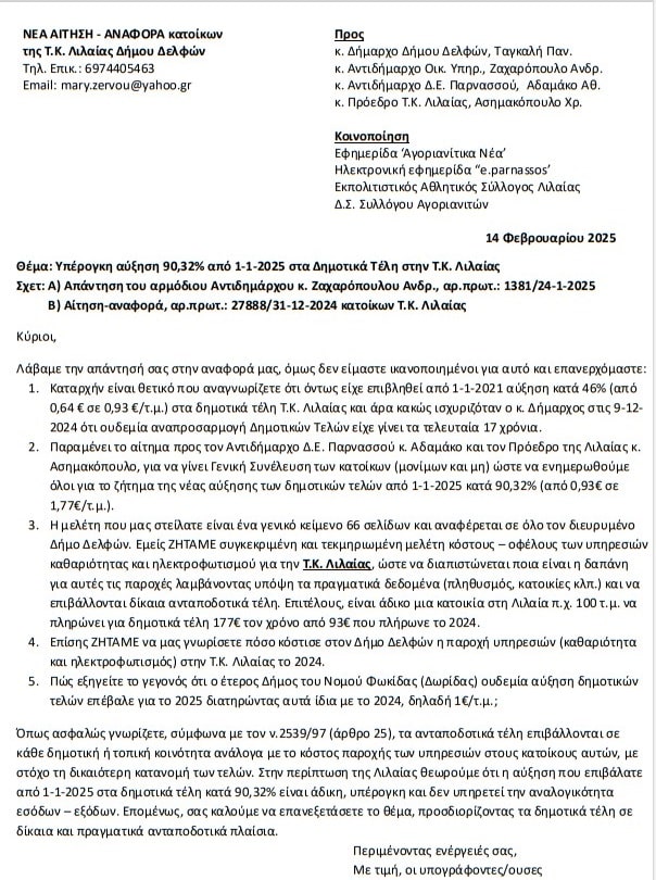 .Νέα -Αίτηση Αναφορά κατοίκων της Τ.Κ. Λιλαίας Δήμου Δελφών για τα ανταποδοτικά τέλη προς το Δήμο Δελφών.