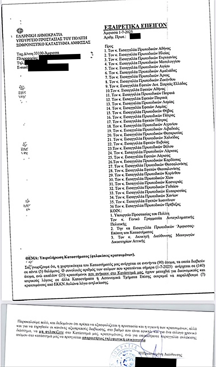 Συγκεκριμένα, στο εσωτερικό έγγραφο αναφέρεται πως: “Η χωρητικότητα του Καταστήματός μας ανέρχεται σε 90 άτομα, τα οποία διαβιούν σε 5 θαλάμους. Ο συνολικός αριθμός των ατόμων που κρατούνται σήμερα (1-7-2025) ανέρχεται σε 140 άτομα, ενώ επιπλέον 25 κρατούμενοι που ανήκουν στο Κατάστημά μας έχουν μεταχθεί για δικονομικούς και ιατρικούς λόγους σε άλλα Καταστήματα ή Αστυνομικά Τμήματα. Επίσης, εκκρεμεί να παραλάβουμε 7 κρατούμενους από ΕΚΚΝ Αυλώνα, λόγω ενηλικίωσης.