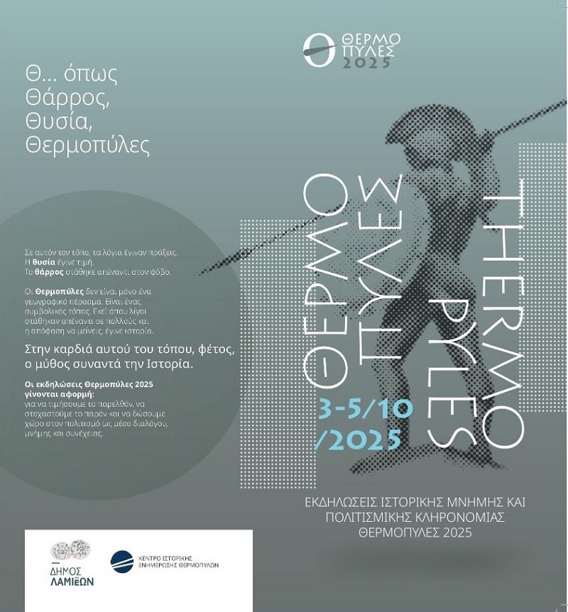 Ο Δήμος Λαμιέων διοργανώνει τις «Εκδηλώσεις ιστορικής μνήμης και πολιτισμικής κληρονομιάς Θερμοπύλες 2025» από τις 3 έως τις 5 Οκτωβρίου 2025, με στόχο να αναδείξουμε την ιστορική παρακαταθήκη της Μάχης των Θερμοπυλών, μεταλαμπαδεύοντάς την στις νέες γενιές.
