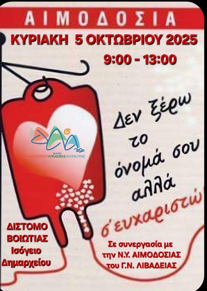 Την Κυριακή 5 Οκτωβρίου 2025, από τις 9:00 έως τις 13:00, πραγματοποιείται εθελοντική αιμοδοσία στο ισόγειο του Δημαρχείου Διστόμου Βοιωτίας, σε συνεργασία με τη Ν.Υ. Αιμοδοσίας του Γ.Ν. Λιβαδειάς.