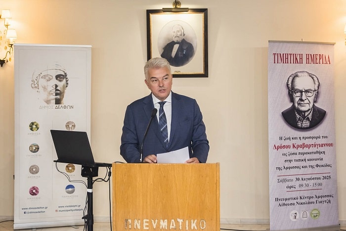 Σε κλίμα συγκίνησης πραγματοποιήθηκε το Σάββατο, 30 Αυγούστου 2025, στην κατάμεστη από κόσμο αίθουσα Νικολάου Γιαγτζή στο Πνευματικό Κέντρο Άμφισσας, η Τιμητική Ημερίδα, αφιερωμένη στον αείμνηστο Δρόσο Κραβαρτόγιαννο, την οποία διοργάνωσαν ο Δήμος Δελφών, το Δίκτυο για τον Πολιτισμό και τον Τουρισμό στη Φωκίδα «Δίκτυο Δελφών» και ο Σύλλογος των Απανταχού Αμφισσέων «Τα Σάλωνα».