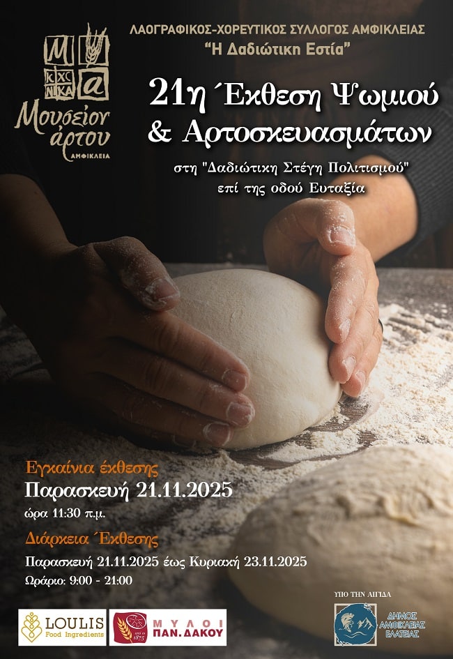 Ο Λαογραφικός Χορευτικός Σύλλογος Αμφίκλειας «Η ΔΑΔΙΩΤΙΚΗ ΕΣΤΙΑ», συνεχίζει μια παράδοση που έχει πλέον ρίζες τεσσάρων δεκαετιών και σας προσκαλεί στην «21η Έκθεση Ψωμιού και Αρτοσκευασμάτων» που θα πραγματοποιηθεί από την Παρασκευή 21 έως και την Κυριακή 23 Νοεμβρίου 2025 στη «Δαδιώτικη Στέγη Πολιτισμού», επί της οδού Ευταξία, στην Αμφίκλεια.