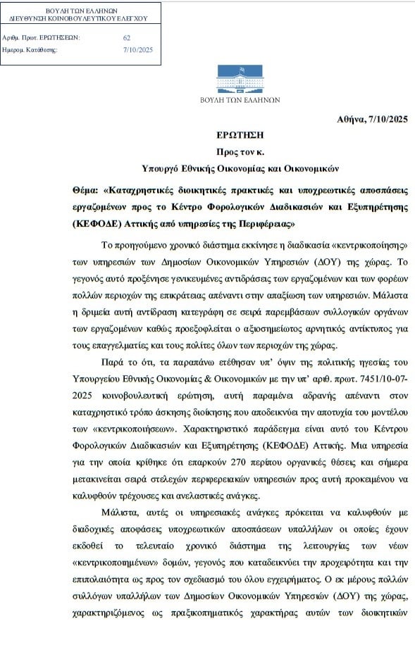 Η απουσία σχεδιασμού, η προχειρότητα και η αδιαφορία για τις ανάγκες των υπηρεσιών της περιφέρειας επιβεβαιώνουν, όπως επισημαίνει ο κ. Σαρακιώτης, την αποτυχία του μοντέλου των “κεντρικοποιήσεων” που προωθεί η κυβέρνηση, μετατρέποντας τη διοίκηση σε πεδίο πειραματισμών εις βάρος των εργαζομένων και των πολιτών. Με την κοινοβουλευτική του ερώτηση προς τον Υπουργό Εθνικής Οικονομίας και Οικονομικών, ο Βουλευτής ζητά: