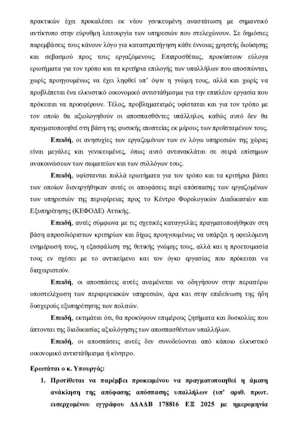 «Η Κυβέρνηση επιτρέπει να διοικείται το κράτος με όρους αυθαιρεσίας, αυταρχισμού και συγκεντρωτισμού. Αντί να στηρίξει τις υπηρεσίες της περιφέρειας, τις απογυμνώνει, μετακινώντας υπαλλήλους με το “έτσι θέλω”, χωρίς σχέδιο, χωρίς σεβασμό και χωρίς διάλογο. Ορισμένοι οφείλουν να καταλάβουν ότι, οι εργαζόμενοι δεν είναι αναλώσιμοι και οι τοπικές κοινωνίες δεν μπορούν να πληρώνουν τα πειράματα των διοικούντων. Η πολιτική ηγεσία του Υπουργείου Εθνικής Οικονομίας και Οικονομικών οφείλει να παρέμβει ώστε να ανακληθούν άμεσα αυτές οι αποφάσεις, αντιλαμβανόμενη ότι, απαραίτητη προϋπόθεση για την εύρυθμη λειτουργία νευραλγικής σημασίας υπηρεσιών είναι η ύπαρξη κανόνων δικαιοσύνης, διαφάνειας, αλλά και σεβασμού προς τον άνθρωπο».