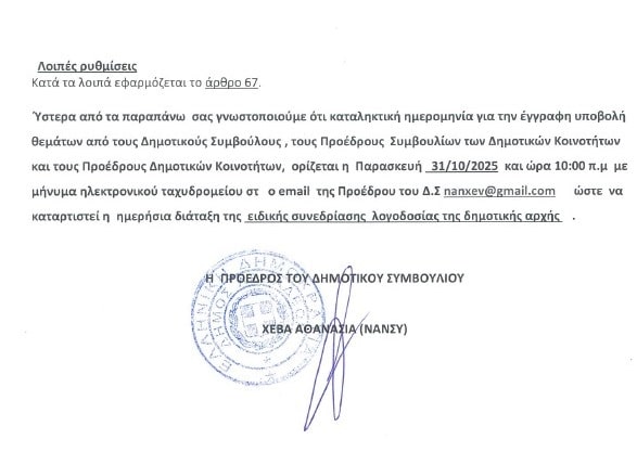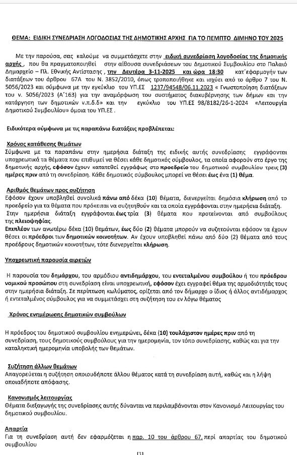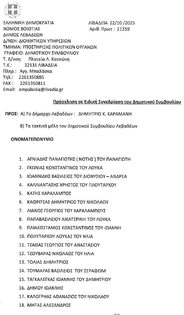 Ο Δήμος Λεβαδέων ανακοινώνει ότι τη Δευτέρα 3 Νοεμβρίου 2025 και ώρα 18:30, θα πραγματοποιηθεί η Ειδική Συνεδρίαση Λογοδοσίας της Δημοτικής Αρχής για το πέμπτο δίμηνο του 2025, στην αίθουσα συνεδριάσεων του Δημοτικού Συμβουλίου, στο Παλαιό Δημαρχείο (Πλ. Εθνικής Αντίστασης).