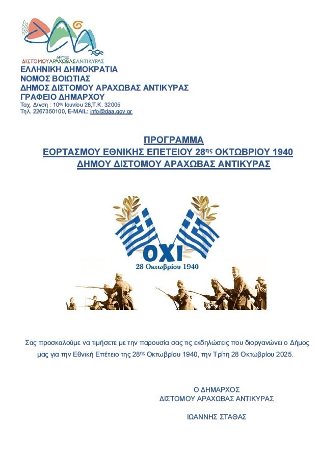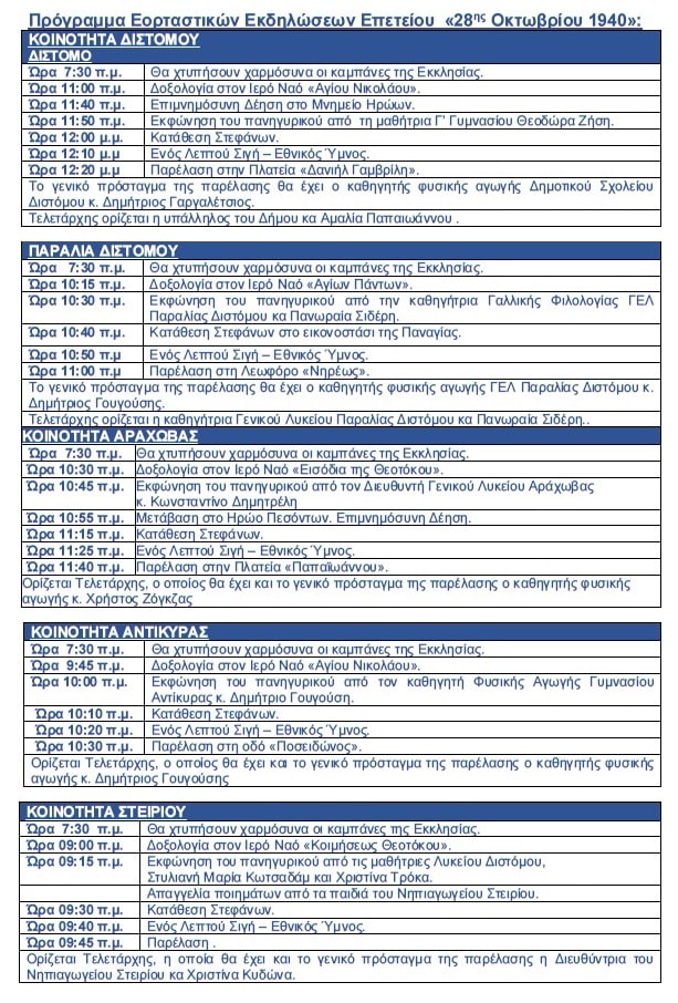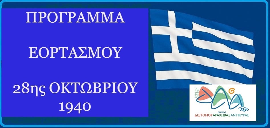ΠΡΟΓΡΑΜΜΑ ΕΟΡΤΑΣΜΟΥ ΕΘΝΙΚΗΣ ΕΠΕΤΕΙΟΥ 28ης ΟΚΤΩΒΡΙΟΥ 1940 ΔΗΜΟΥ ΔΙΣΤΟΜΟΥ ΑΡΑΧΩΒΑΣ ΑΝΤΙΚΥΡΑΣ