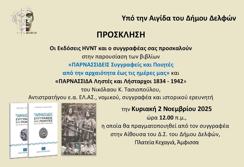 Οι εκδόσεις HVNT και ο συγγραφέας κ. Νικόλαος Κ. Τασιόπουλος προσκαλούν στην παρουσίαση των βιβλίων «ΠΑΡΝΑΣΣΙΔΕΙΣ Συγγραφείς και Ποιητές από την αρχαιότητα έως τις ημέρες μας» και «ΠΑΡΝΑΣΣΙΔΑ Ληστές και Λήσταρχοι 1834-1942».