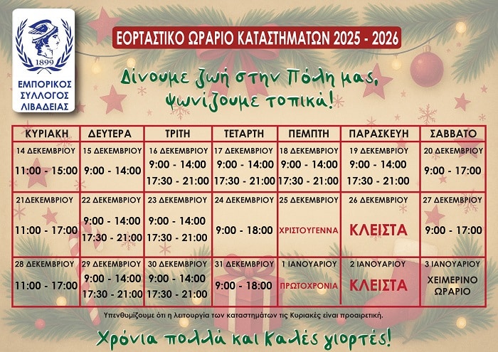 Ο Εμπορικός Σύλλογος Λιβαδειάς ανακοίνωσε το εορταστικό ωράριο λειτουργίας των καταστημάτων για την περίοδο των Χριστουγέννων και της Πρωτοχρονιάς 2025–2026.