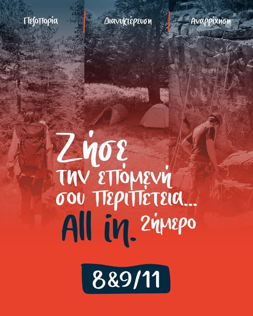 Απαραίτητος εξοπλισμός: μποτάκια ή αθλητικά ορεινής πεζοπορίας (trail ή trekking), σκηνή, υπνόσακος ατομικός, υπόστρωμα.