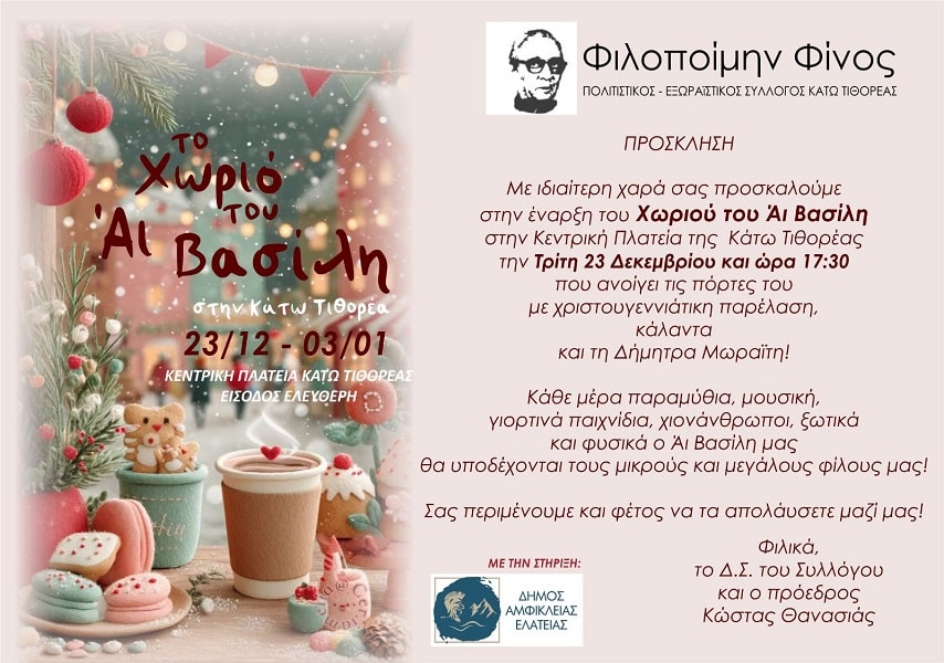 Ο Πολιτιστικός – Εξωραϊστικός Σύλλογος Κάτω Τιθορέας «Φιλοποίμην Φίνος» σας προσκαλεί με ιδιαίτερη χαρά στην έναρξη του «Χωριού του Άι Βασίλη», στην Κεντρική Πλατεία Κάτω Τιθορέας.