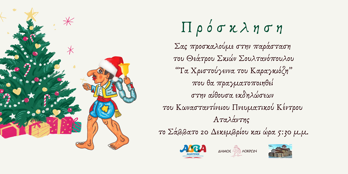 Ο Δήμος Λοκρών και το ΑΙΑΝΤΕΙΟ Κέντρο Πρόληψης προσκαλούν μικρούς και μεγάλους σε μια ξεχωριστή χριστουγεννιάτικη παράσταση Θεάτρου Σκιών. Το Θέατρο Σκιών Σουλτανόπουλου παρουσιάζει το εορταστικό έργο «Τα Χριστούγεννα του Καραγκιόζη», γεμάτο γέλιο, ζωντάνια και την αγαπημένη λαϊκή φιγούρα που συνεχίζει να συναρπάζει γενιές.