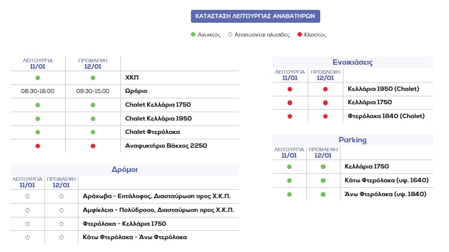 Το Χιονοδρομικό Κέντρο Παρνασσού βρίσκεται σε περιορισμένη λειτουργία, με 2 από τους 17 αναβατήρες να εξυπηρετούν το κοινό, Αφροδίτη (8θέσιος αναβατήρας), Αφροδίτη 7 (Φτερόλακα)
