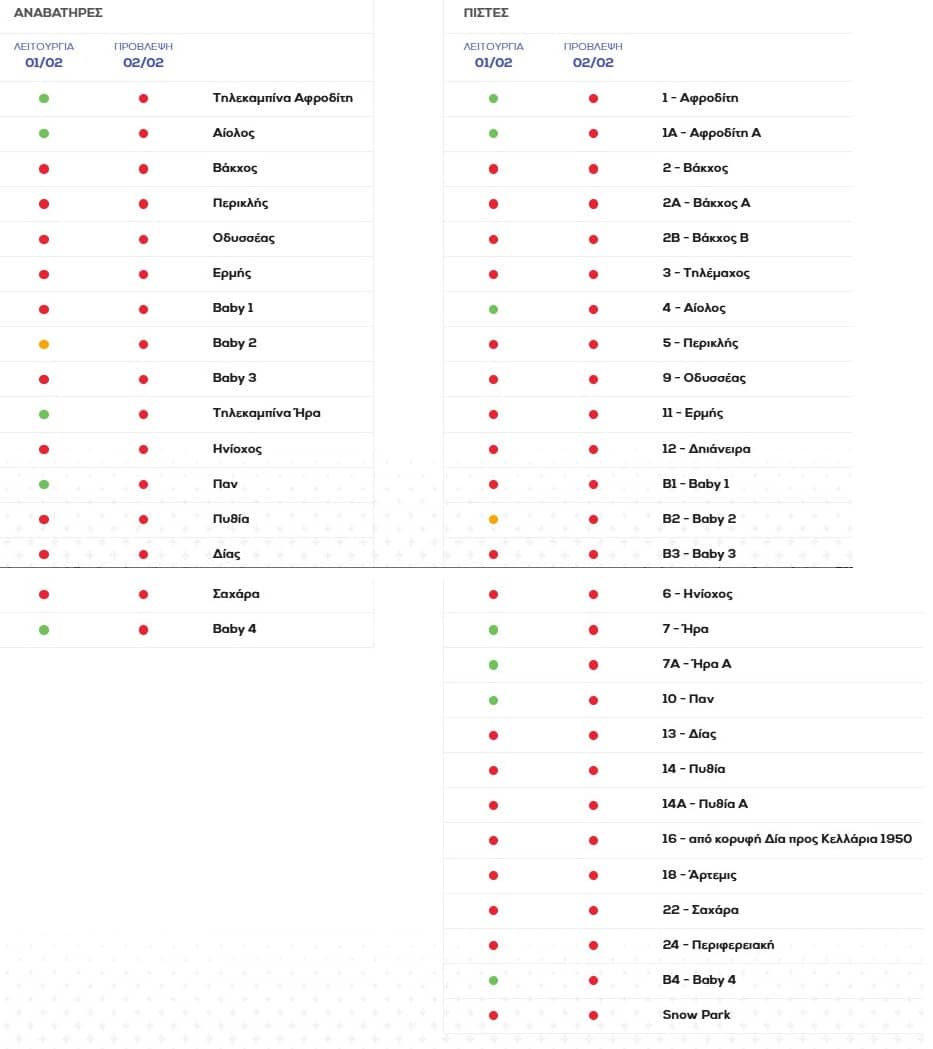 Σε λειτουργία βρίσκονται οι πίστες Αφροδίτη, Αίολος 11, Ερμής 7, Φτερόλακα 10, Φτερόλακα Αφροδίτη Α (Νο 1), Αίολος (Νο 4), Ήρα Α (Νο 7), Ηρακλής (Νο 8), Παν (Νο 10), καθώς και το Baby lift 4. Οι δρόμοι πρόσβασης είναι ανοιχτοί, ωστόσο η κίνηση πραγματοποιείται μόνο με αντιολισθητικές αλυσίδες.