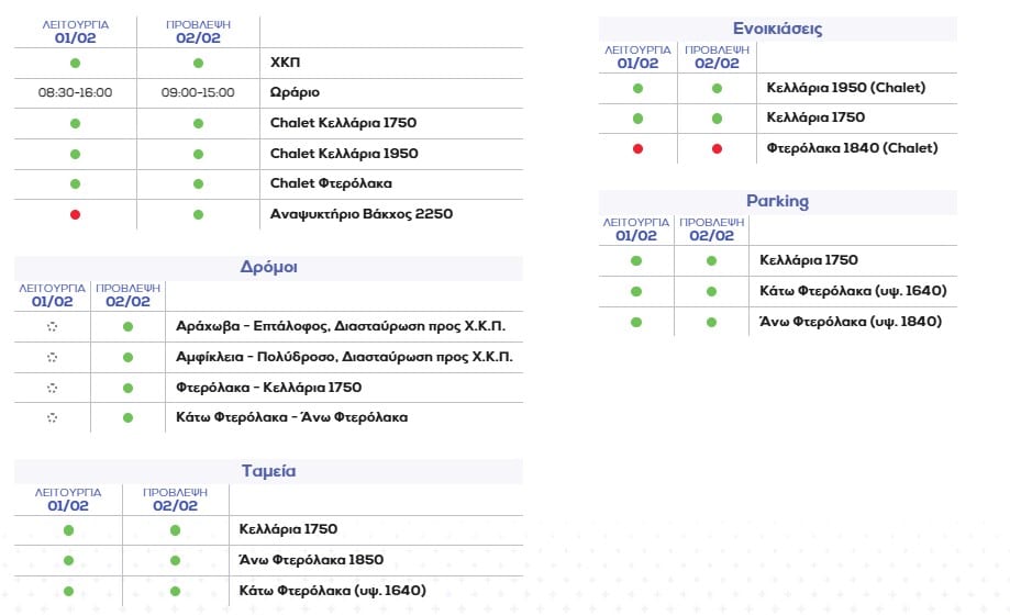 Σε λειτουργία βρίσκονται οι πίστες Αφροδίτη, Αίολος 11, Ερμής 7, Φτερόλακα 10, Φτερόλακα Αφροδίτη Α (Νο 1), Αίολος (Νο 4), Ήρα Α (Νο 7), Ηρακλής (Νο 8), Παν (Νο 10), καθώς και το Baby lift 4. Οι δρόμοι πρόσβασης είναι ανοιχτοί, ωστόσο η κίνηση πραγματοποιείται μόνο με αντιολισθητικές αλυσίδες.