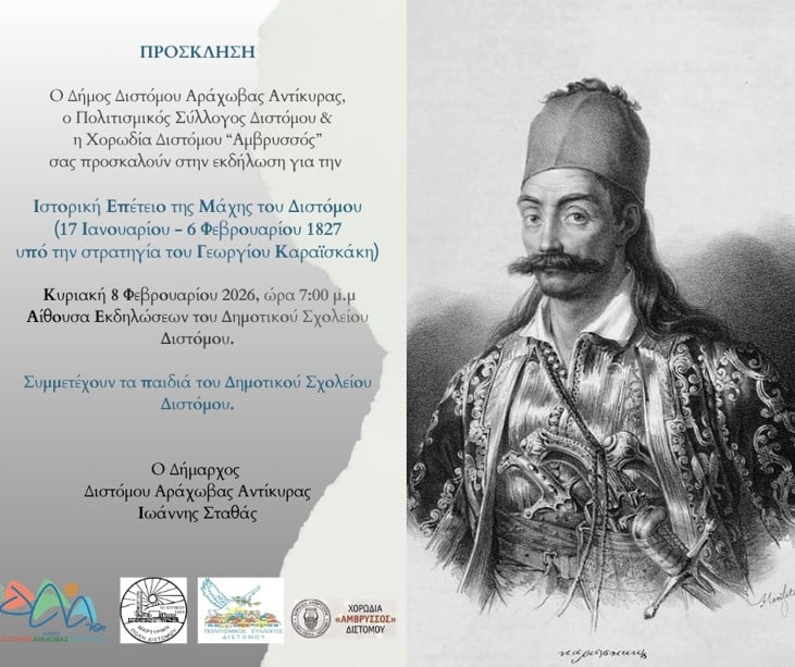 Με σεβασμό στην ιστορική μνήμη και βαθιά αίσθηση τιμής προς τους αγωνιστές της Ελληνικής Επανάστασης, ο Δήμος Διστόμου – Αράχωβας – Αντίκυρας, ο Πολιτιστικός Σύλλογος Διστόμου και η Χορωδία Διστόμου «Αμβρυσσός» διοργανώνουν επετειακή εκδήλωση για την Ιστορική Επέτειο της Μάχης του Διστόμου.