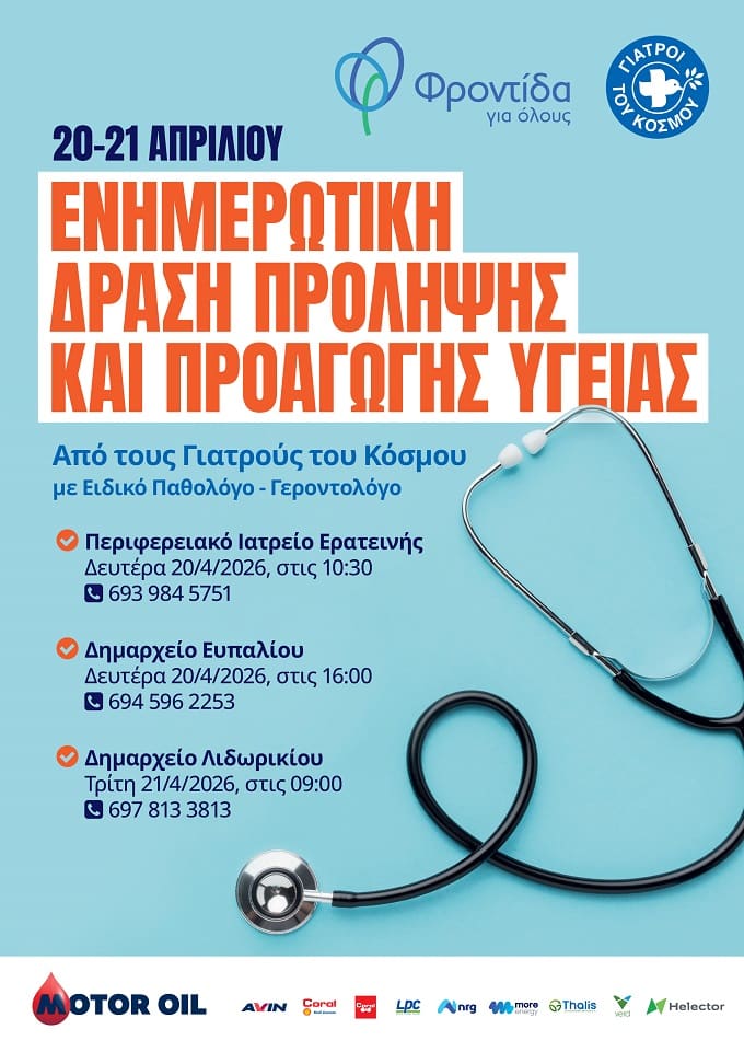 Στο πλαίσιο της συνεργασίας αυτής, προγραμματίζεται ενημερωτική δράση πρόληψης και προαγωγής υγείας, η οποία θα πραγματοποιηθεί στις 20 και 21 Απριλίου 2026 στο Δήμο Δωρίδος, με τη συμμετοχή εξειδικευμένου ιατρού παθολόγου – γεροντολόγου.