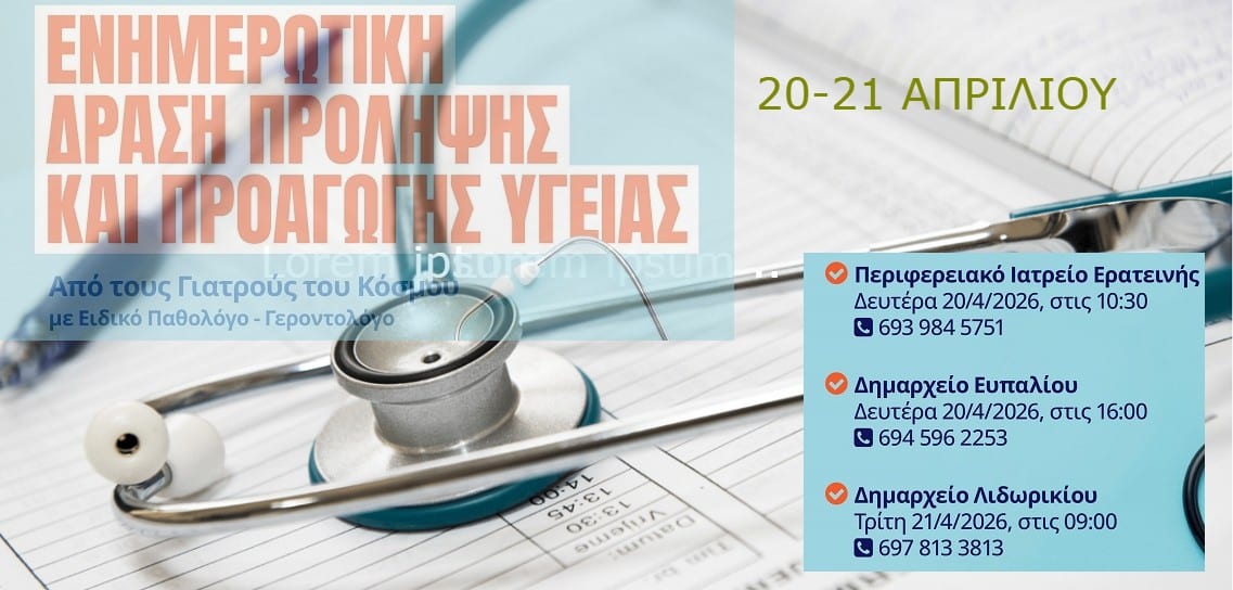 Τη Δευτέρα 20 Απριλίου 2026 η δράση θα πραγματοποιηθεί στο Περιφερειακό Ιατρείο Ερατεινής, ώρα 10:30.
