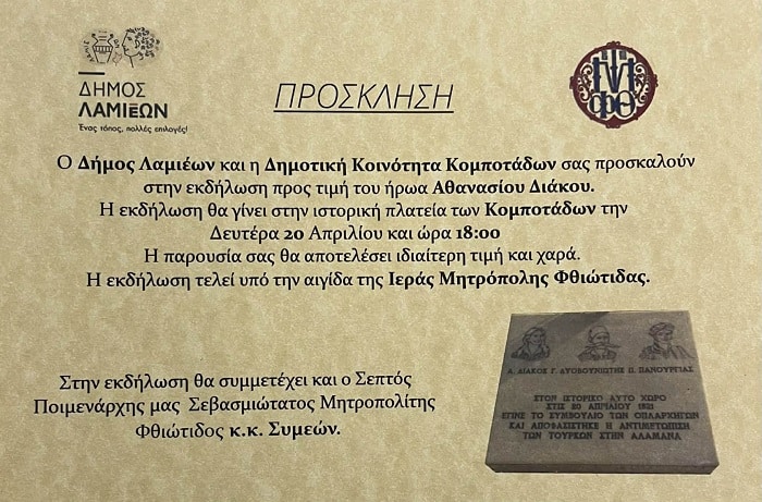 Ο Δήμος Λαμιέων σε συνεργασία με την Δημοτική Κοινότητα Κομποτάδων, στο πλαίσιο των εκδηλώσεων προς τιμήν του ήρωα Αθανασίου Διάκου και της επετείου της μάχης της Αλαμάνας, διοργανώνει «Εκδήλωση προς τιμήν του ήρωα Αθανασίου Διάκου» που θα πραγματοποιηθεί την Δευτέρα 20 Απριλίου 2026 και ώρα 18.00 στην ιστορική πλατεία  Κομποτάδων, υπό την αιγίδα της Ιεράς Μητρόπολης Φθιώτιδας.