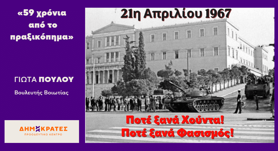 Η χούντα των Συνταγματαρχών κατέλυσε τους δημοκρατικούς θεσμούς και βύθισε τη χώρα στο σκοταδισμό, τον αυταρχισμό, τον φόβο και την εθνική ταπείνωση που κορυφώθηκε με την τραγωδία της Κύπρου.