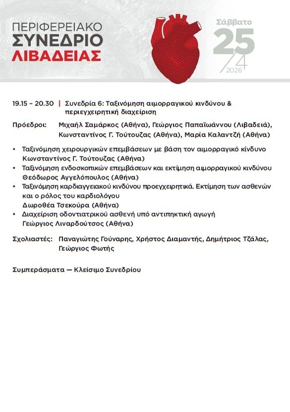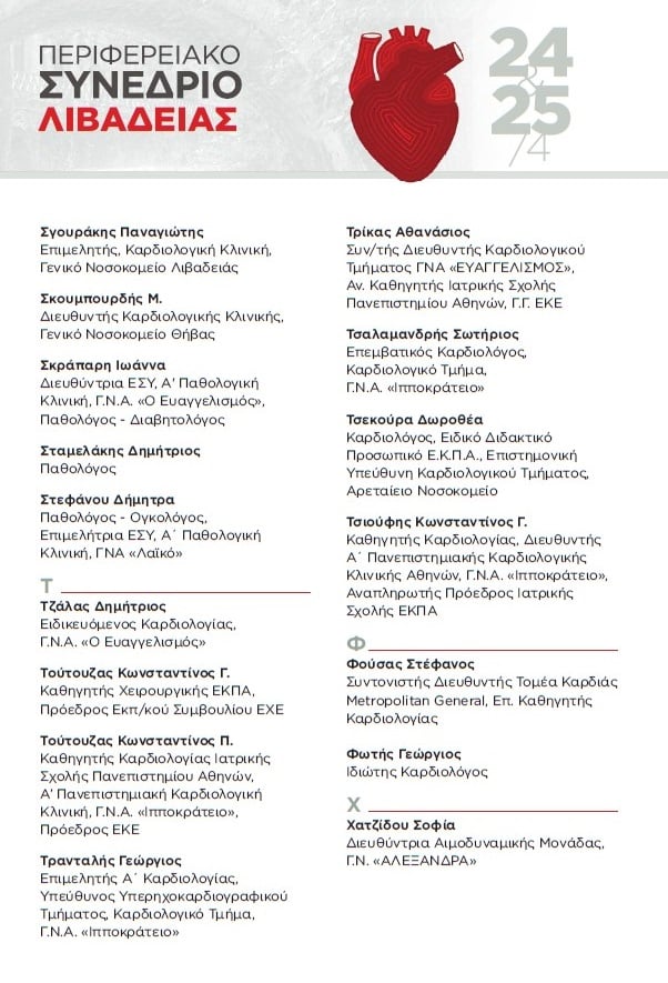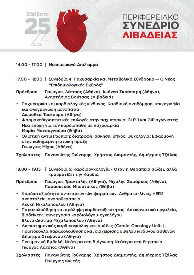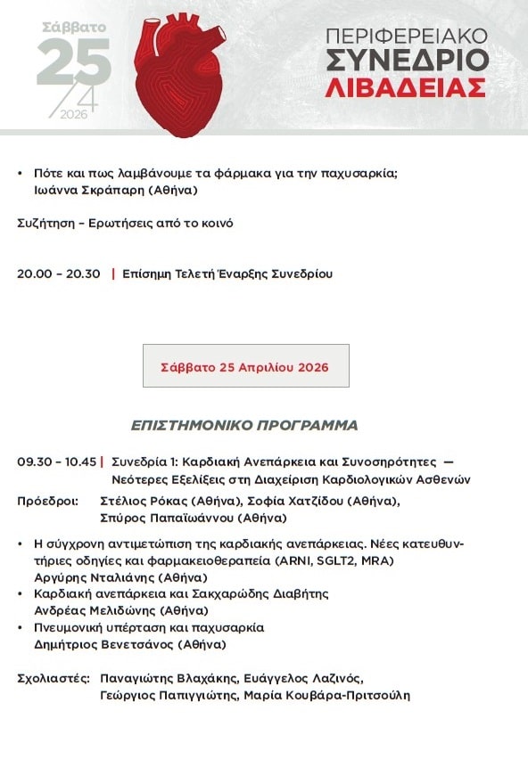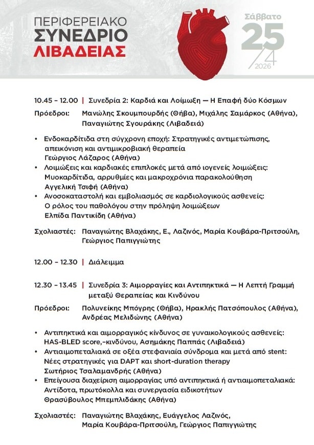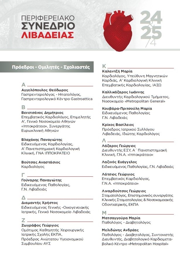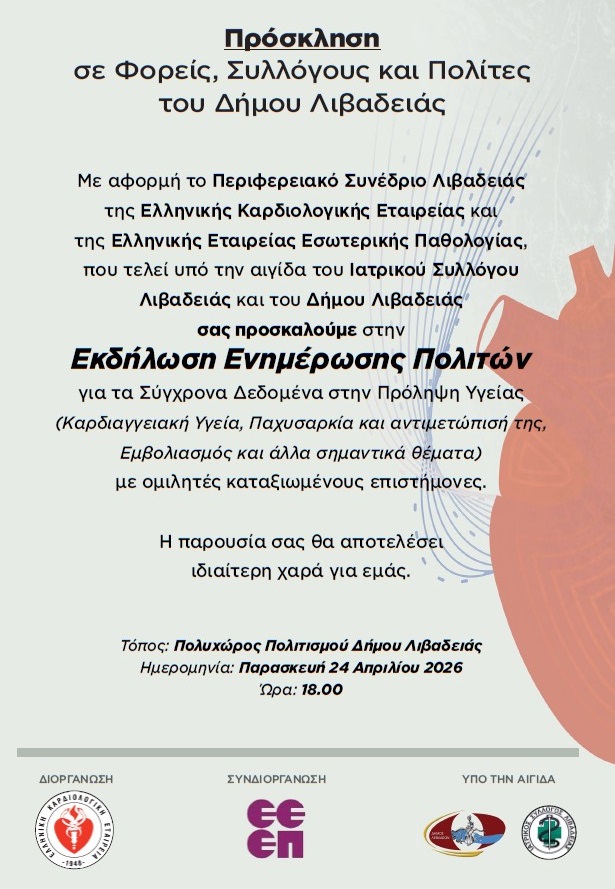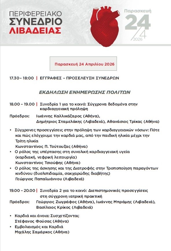 Στη Λιβαδειά στρέφεται το ενδιαφέρον της ιατρικής κοινότητας, καθώς στις 24 και 25 Απριλίου 2026 πραγματοποιείται το Περιφερειακό Καρδιολογικό Συνέδριο της Ελληνικής Καρδιολογικής Εταιρείας, σε συνεργασία με την Ελληνική Εταιρεία Εσωτερικής Παθολογίας και υπό την αιγίδα του Ιατρικού Συλλόγου και του Δήμου Λιβαδειάς.