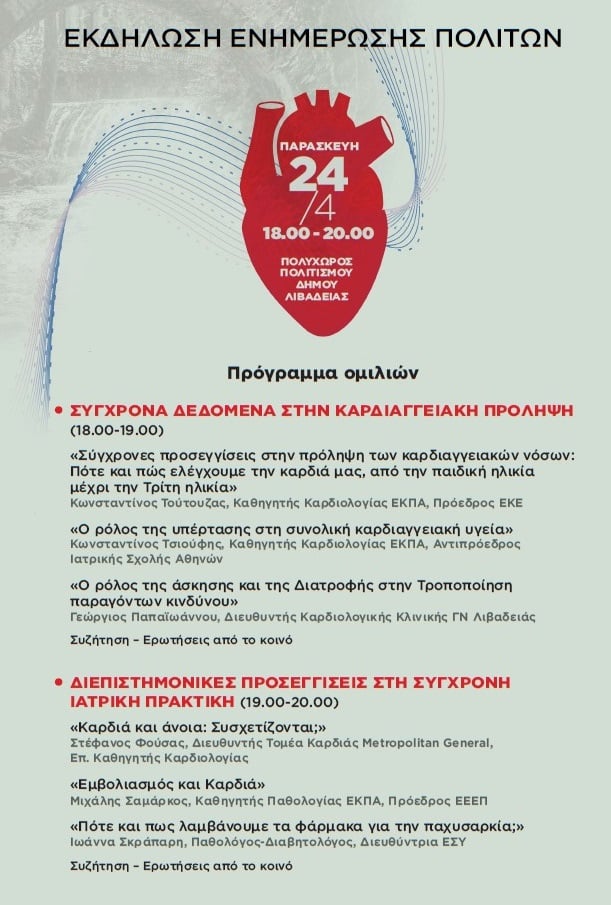 Ιδιαίτερο ενδιαφέρον παρουσιάζει η εκδήλωση ενημέρωσης πολιτών την Παρασκευή 24 Απριλίου, όπου εξειδικευμένοι επιστήμονες παρουσιάζουν πρακτικές συμβουλές και σύγχρονα δεδομένα για την πρόληψη των καρδιαγγειακών νοσημάτων, τη σημασία της άσκησης και της διατροφής, αλλά και θέματα όπως η υπέρταση και ο εμβολιασμός.