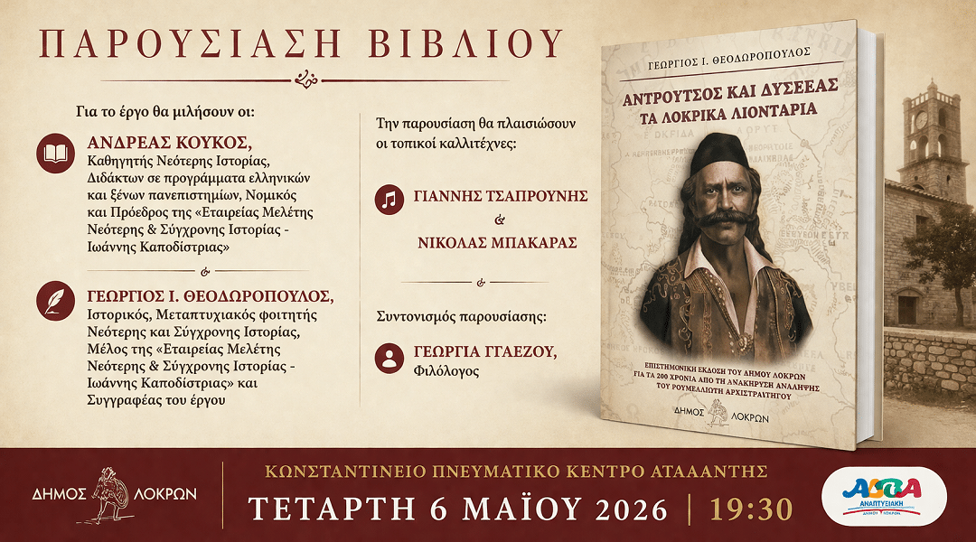 Μια ξεχωριστή εκδήλωση ιστορικού και πολιτιστικού ενδιαφέροντος θα πραγματοποιηθεί στην Αταλάντη, με αφορμή την παρουσίαση του βιβλίου «Αντρούτσος και Δυσσέας – Τα Λοκρικά Λιοντάρια» του Γεωργίου Ι. Θεοδωρόπουλου.
